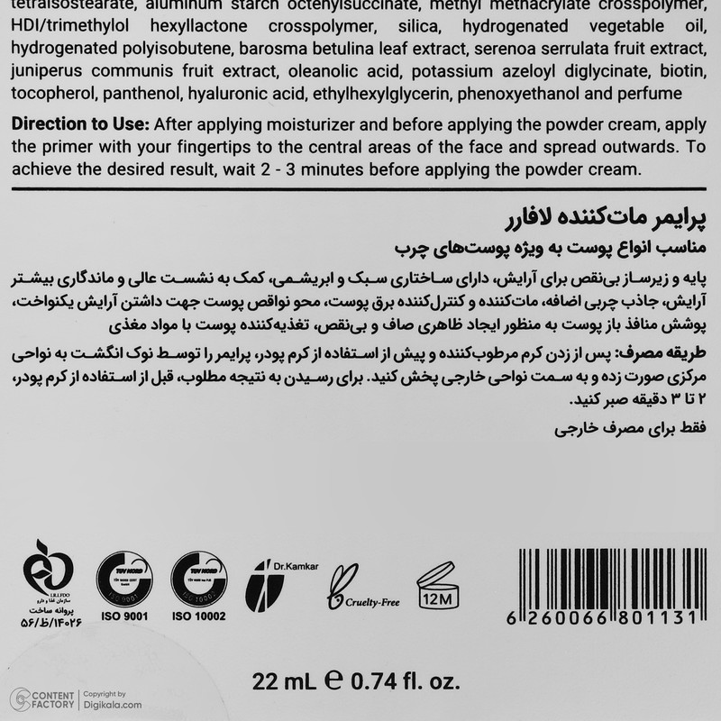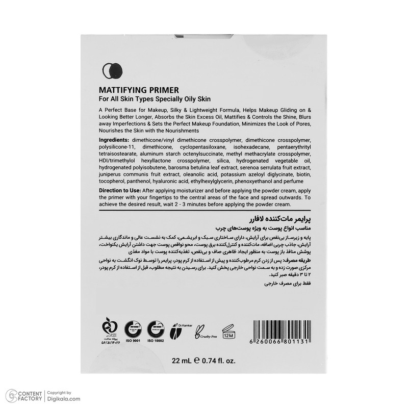 | سایر توضیحات | پایه و زیرساز بینقص برای آرایش/ دارای ساختار سبک و ابریشمی/ کمک به نشست عالی و ماندگاری بیشتر آرایش/ آبرسان و تغذیهکننده پوست با مواد مغذی/ کمک به داشتن پوستی نرم و لطیف/ محو نواقص پوست جهت داشتن آرایش یکنواخت، پوشش منافذ باز پوست به منظور ایجاد ظاهری صاف و بینقص/ مات کننده و کنترل کننده برق پوست. |