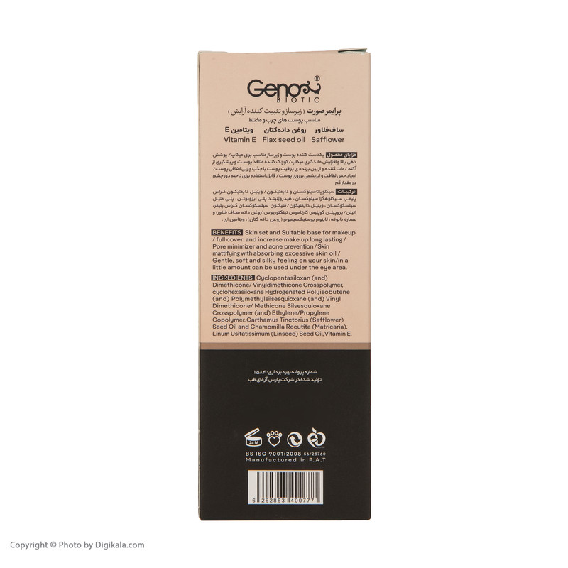 | سایر توضیحات | یکدست کننده پوست و آماده سازی صورت جهت میکاپ پوشش دهی بالا و افزایش ماندگاری میکاپ کوچک کننده منافذ پوست و پیشگیری از آکنه مات کننده و از بین برنده ی براقیت پوست ایجاد حس لطافت و ابریشمی بر روی پوست |